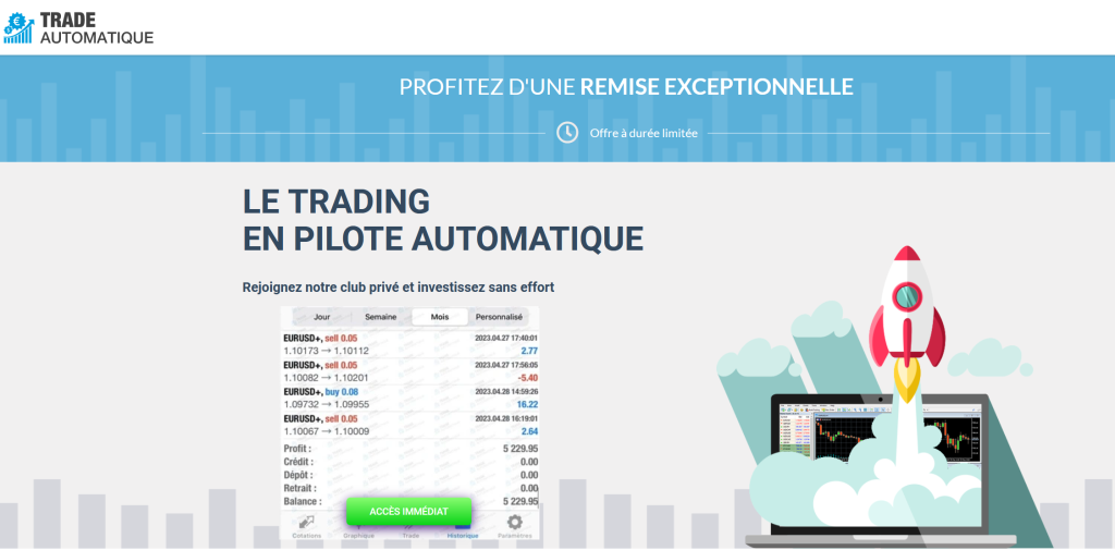 "Trade Automatique" est une plateforme qui promet de transformer l'expérience de trading grâce à l'utilisation de robots de trading automatisés. En adhérant à leur service, les membres peuvent investir sur les marchés financiers en mode pilote automatique, bénéficiant de la sélection rigoureuse d'intelligences artificielles qui optimisent les stratégies de trading en temps réel. Le service inclut l'installation à distance, un support continu et l'accès à une communauté privée pour échanger avec d'autres membres et experts.
